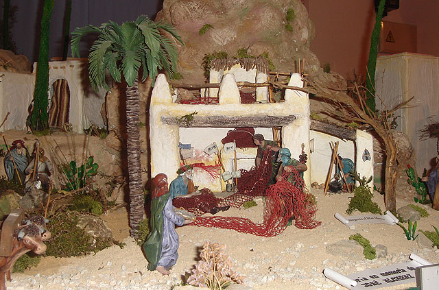 El Belén que ocupa unos 12 metros cuadrados está realizado íntegramente por Salvador Navarro que ha empleado unos 3 meses en levantar y perfilar toda una estructura de montañas, desierto, ríos, casas, y otras escenas, utilizando diferentes materiales entre los que predomina el corcho blanco y la escayola. El centenar figuras belenísticas que incluye, todas de su propiedad, son de factura murciana, y no faltan los guiños locales con una escena de pescadores cosiendo redes, o la reproducción del monumento Puertas del Mar, ubicado en la entrada a la localidad.