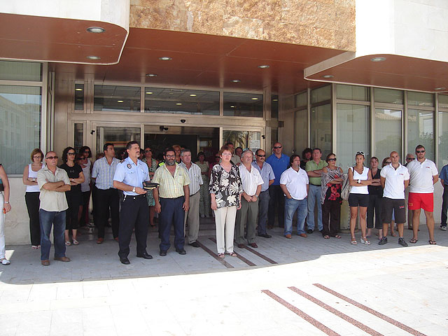 La alcaldesa de San Javier, Pepa García, varios miembros de la corporación municipal, funcionarios y vecinos, se han concentrado a las 12:00 de esta mañana en la puerta del ayuntameinto para guardar un minuto de silencio como señal de condena y repulsa de los recientes atentados de ETA, en el último de los cuales perpetrado en Calviá, Mallorca han muerto dos guardias civiles.