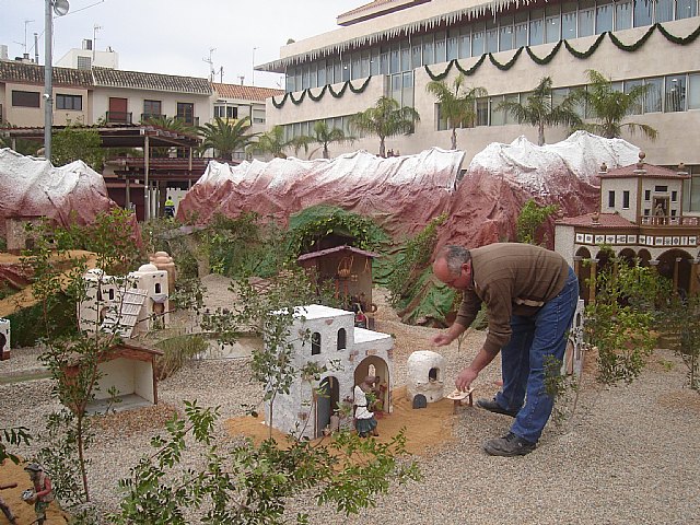 El montaje del Belén lleva más de diez días y la intervención de 14 personas entre fontaneros, albañiles, electricistas y jardineros, que este año, debido a la lluvia, han tenido que redoblar esfuerzos para que esté terminado mañana. José Antonio Soler lleva más de 20 años al frente del Belén que conoce muy bien desde niño, cuando su padre José Soler, se unió a Alfonso Meca creador del Belén en 1969 junto a Luis Vega, en la segunda edición.