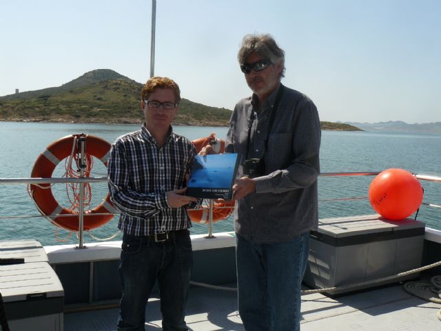 A bordo de una embarcación y con unos cuarenta invitados del ámbito académico, empresarial, vecinal y ecologista, el edil de Medio Ambiente explicó que se ha tratado de "contextualizar la presentación del libro con el hábitat que refleja", como el Mar Menor que junto con las encañizadas del Ventorrillo y de La Torre, la playa de la Hita y la isla Grosa conforman los escenarios retratados por Villaescusa.