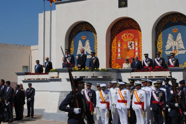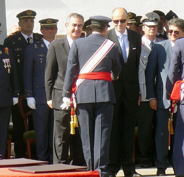 El delegado del Gobierno en Murcia, Rafael González Tovar, la directora general de Personal de Defensa, Adoración Matas, el director general de Enseñanza Militar de Defensa, Javier García, el alcalde de Los Alcázares Anastasio Bastida, y el coronel director de la AGA y anfitrión, Juan Antonio Ortega, completaban la presidencia del "acto más importante del curso escolar", en el que el teniente Luis Gómez-Guillamón Pérez, número uno de la LXII promoción del cuerpo general, escala de oficiales, recibió la Cruz de Mérito Aeronáutico con distintivo blanco.