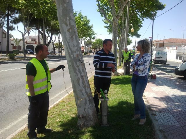 Los árboles que jalonan la avenida Aviación y Mar Menor, entre San Javier y Santiago de la Ribera, denominados "Plátanos de sombra" están siendo objeto, por primera vez, de una tratamiento por parte de la concejalía de Parques y Jardines con un componente fungicida según informó la concejala de Parques y Jardines, Celia Martínez.