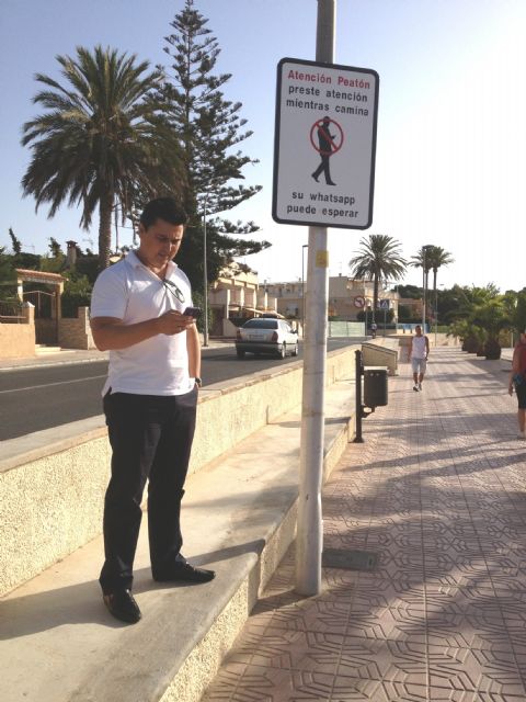 "Atención peatón, preste atención mientras camina, su whatsapp puede esperar" es el lema de las cinco señales que se han instalado en zonas como la playa Castillicos, cuyo acceso no es peatonal, como en el paseo Colón, y otras cercanas a institutos, colegios y centros de enseñanza, como el Conservatorio y la Escuela de Idiomas, en San Javier.