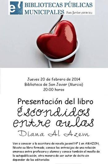 La escritora Diana Al Azem presenta mañana jueves 20 de febrero a las 20:00h. en la biblioteca de San Javier su exitosa novela "Escondidos entre aulas" con la que ha llegado a ser número 1 de descargas en la plataforma de libros en internet, Amazon.