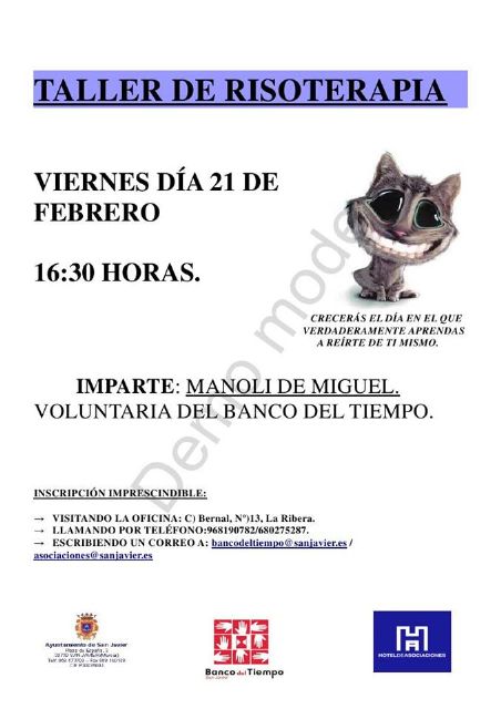 El Banco del Tiempo vuelve a convocar un taller de risotorapia dentro de su programación, que se celebrará el próximo viernes 21 de febrero a las 16:30h. en el edificio del Centro de Servicios Sociales municipal, en Santiago de la Ribera .