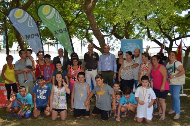El director general de Planificación Sociosanitaria, Farmacia y Atención al Ciudadano, Arturo Giménez, el alcalde de San Javier, Juan Martínez y el concejal de Deportes, Carlos Albaladejo entregaron hoy las medallas a los 12 niños que han participado en el campus del programa "Activa Familias" que se clausuró esta mañana en el Polideportivo Municipal de San Javier.