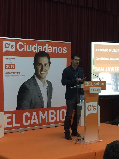 A continuación fue el turno para Miguel Sánchez, cuya intervención no tuvo desperdicio, y que se confesó con los asistentes al reconocer que en San Javier había comenzado todo para él: "Antonio es el artífice de que yo esté hoy aquí, pues fue él quien me insistió en que este era el partido" que podía cambiar España; y recordó que fue Antonio Murcia quien le convenció para ir a Madrid a un acto de movimiento ciudadano, que había sido promovido por el partido de Albert Rivera, lugar donde definitivamente decidió sumarse a este gran proyecto de cambio que representa Ciudadanos C's. Tras estas palabras de agradecimiento se dirigió a Antonio para recordarle la gran responsabilidad que tenían, debido a la confianza y la ilusión que la gente estaba depositando en Ciudadanos (C's), y que ellos no podían fallar a tanta ilusión, a tanta gente, "no podemos darles la espalda" porque "si los políticos le dan la espalda a los ciudadanos, los ciudadanos se la darán a los políticos", y "nosotros no podemos fallarles"; y, por tanto, animó a todos a sumarse al cambio el próximo domingo día 24 de mayo porque ese día "los vamos a desahuciar", en alusión a los políticos profesionales. Y señalando a los dos grandes partidos nacionales, Partido Popular y PSOE, les recriminó que "ya no tienen un plan para España y los españoles", pero "sí para ellos y sus chiringuitos". Y por ello, continuó diciendo, "nos tienen miedo, porque estamos haciendo historia, porque estamos haciendo una segunda transición". Y recordó que la ciudadanía está harta de ver "políticos corruptos, profesionales, que no han hecho otra cosa en su vida que trabajar desde las bases de su partido, pegando carteles; y no habiendo hecho nada anteriormente, ahora quieren ser Presidente de la Comunidad Autónoma de Murcia". No obstante, a pesar de sus fuertes alusiones a candidatos de otros partidos, volvió a serenar su discurso confesando que "no venimos a destruir, sino a construir; a implementar" para cimentar una nueva sociedad donde "se acabe la trinchera y el rencor". Igualmente recordó a Antonio Murcia que esto de la política no era para siempre. "La política debe ser una vocación de servicio público, finita", con un periodo máximo de gobierno de 8 años; augurándole a Antonio Murcia que sería el próximo alcalde de San Javier, lo cual arrancó los aplausos espontáneos de los concurrentes, y prosiguió diciendo que, por tanto, dentro de 8 años Antonio no podrá presentarse a la Alcaldía de San Javier porque "habrás agotado el plazo máximo" que Ciudadanos propone que se cumpla y "te tendrás que marchar, Antonio. Sí, Antonio… Te tendrás que marchar…. Y si no lo haces tú voluntariamente, será el propio partido el que te echará a ti de aquí".