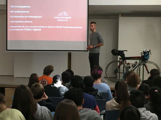 El joven Sergio Cepeda, natural de Tomelloso que estudia el Grado en Ciencias del Deporte en el campus de la UMU en San Javier, ofreció una charla a alumnos de 4° de la ESO sobre su experiencia como promotor de una iniciativa benéfica e invitó a los jóvenes a poner en marcha cualquier actividad con la que contribuir ya sea a lucha contra el cáncer y otras causas.