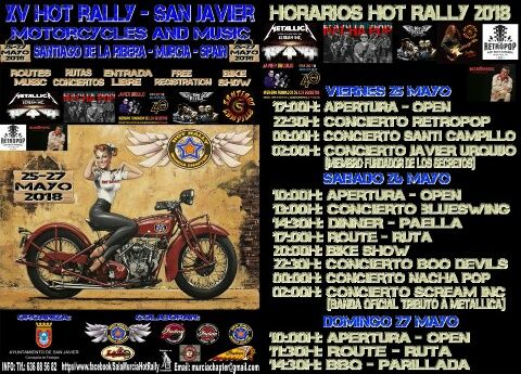 La apertura del XV Hot Rally San Javier Motorcycles and Music tendrá lugar mañana viernes 25 de mayo a las 17h. La música en directo comenzará a sonar en la explanada Barnuevo a las 22.30h con Retropop, seguido a las 00h por Santi Campillo, guitarrista de rock murciano, que fuera fundador de M-Clan. La noche acabará con Javier Urquijo, miembro fundador de Los Secretos.