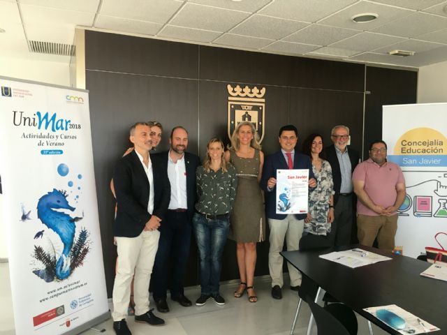 El alcalde de San Javier, José Miguel Luengo y la directora de la Universidad Internacional del Mar , Mercedes Bernabé presentaron hoy en el Ayuntamiento de San Javier los cursos de verano que tendrán lugar desde el 6 de julio al 23 de septiembre en la sede de San Javier, en un acto que contó con la presencia de la concejala de Educación, Catalina Pérez, el Vicerrector de la Facultad de Ciencias del Deportes, de San Javier, Manuel Gómez y los directores de los cursos que se impartirán en el municipio.