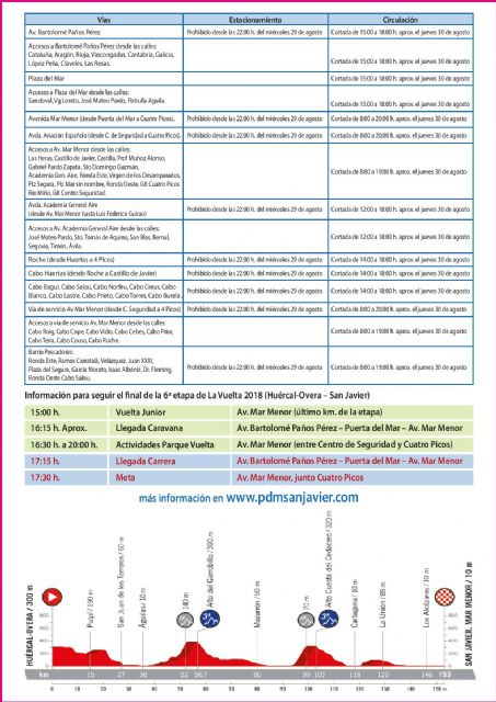 La zona que albergará toda la infraestructura propia de un final de etapa de La Vuelta se sitúa en las avenidas, contiguas, Mar Menor y Aviación Española por lo que las citadas avenidas y calles adyacentes, se verán afectadas por cortes de tráfico, desde distintas horas dependiente de la vía, y prohibición de aparcar desde las 22h del miércoles 29 de agosto en todos los casos. La avenida Bartolomé Paños y Puertas del Mar tendrá el tráfico cortado desde las 15h hasta las 18h.
