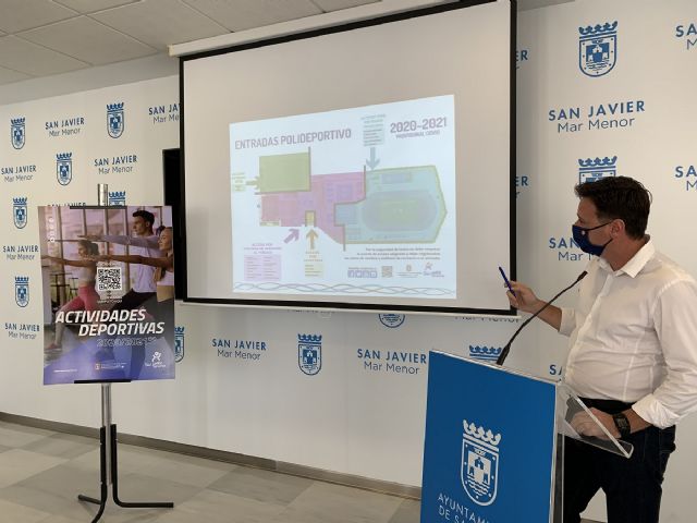 El concejal de Deportes, Sergio Martínez presentó hoy el inicio de las actividades deportivas en el polideportivo municipal de San Javier que empezarán de manera escalonada a partir del próximo lunes 5 de octubre, siguiendo las directrices de la Orden de 24 de septiembre de la Consejería de Turismo, Juventud y Deportes por la que regula la actividad deportiva en la Región de Murcia.