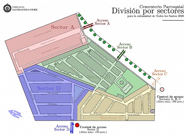 El cementerio permanece abierto de 08:30 a 18:00 hasta el 15 de noviembre, divido en cuatro sectores, con aforo máximo de 150 personas por sector, y dos controles de acceso