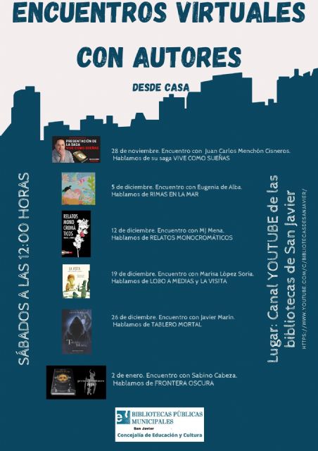 La biblioteca de San Javier sigue fomentando las actividades Online sin renunciar a su intensa actividad cultural con especial atención a su canal de Youtube donde ahora presenta los "Encuentros virtuales con autores desde casa". Se trata de una ciclo de encuentros con diversos escritores que se producirá todos los sábados desde el próximo 28 de noviembre hasta el 2 de enero de 2021 a las 12:00h , en los que se hablará de sus trayectorias y libros y otros asuntos literarios.
