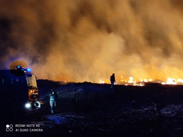 En total de siete vehículos de extinción de incendios del Consorcio de Extinción de Incendios y Salvamento de la Región de Murcia, CEIS, han participado a lo largo de toda la madrugada y de esta mañana en la extinción del incendio que se generó , por causas todavía desconocidas, sobre la 1 de la madrugada, hora en la que se personó en la zona la Policía Local de San Javier. A las labores de extinción se sumaron un total de siete tractores con palas cargadoras que se han ocupado de echar tierra para sofocar las llamas.