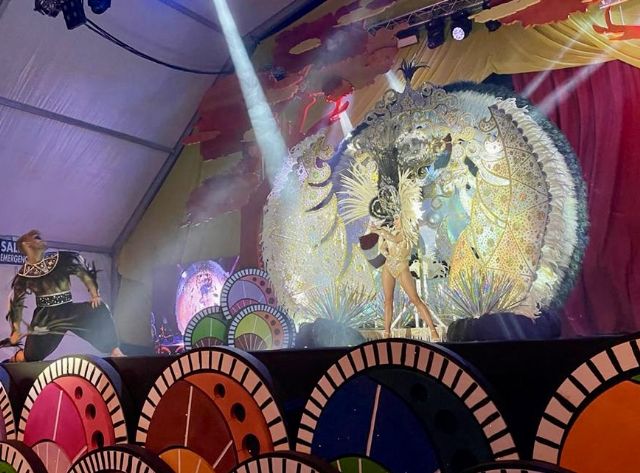 La joven Nerea Vega, musa de la comparsa Yembé, que presentó su propuesta acompañada por el muso David López, se hizo con el título de Reina del Carnaval de Santiago de la Ribera 2022, en la gala celebrada el pasado sábado en la carpa de Carnaval de la explanada Barnuevo de la localidad.
