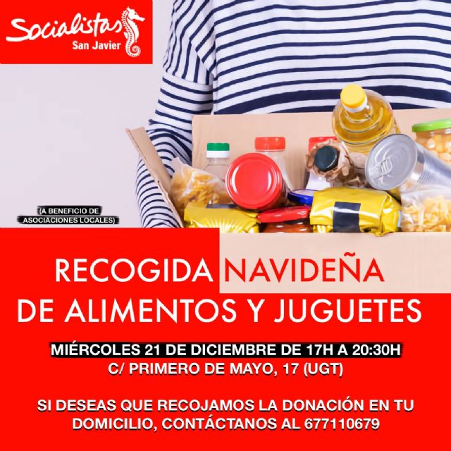 El secretario general del PSOE de San Javier, Pedro Górriz, ha informado que los socialistas del municipio han organizado para este miércoles, 21 de diciembre una recogida de alimentos y juguetes de cara a colaborar con las asociaciones locales en su campaña de Navidad de ayuda a las familias sanjaviereñas más necesitadas.