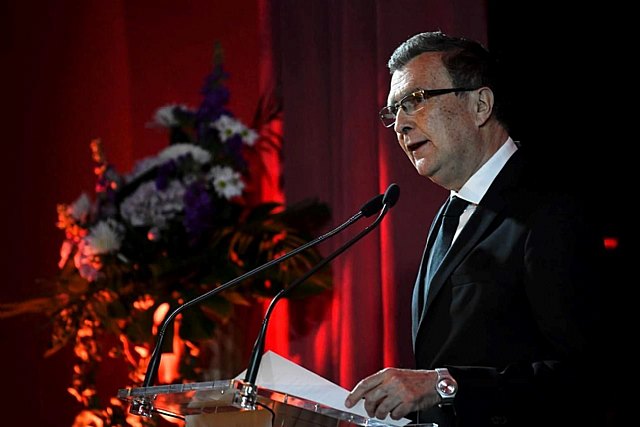 El pregón de José Ballesta fue aplaudido largamente por el público que llenó el teatro del centro “Príncipe de Asturias”, de Santiago de la Ribera.