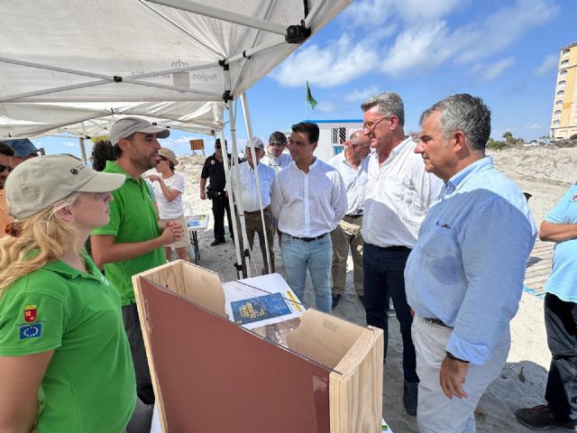El alcalde de San Javier, José Miguel Luengo acompañó hoy al consejero de Medio Ambiente, Universidades , Investigación y Mar Menor, Juan María Vázquez y el conseller de Medio Ambiente, Infraestructuras y Territorio, de la Comunidad Valenciana, Vicente Martínez, durante una visita a la instalación balizada donde se encuentran 92 huevos de tortuga boba, en la zona norte de La Manga.
