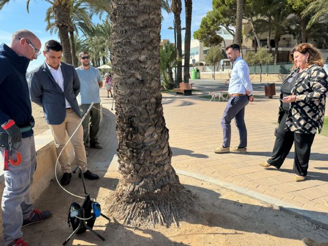 El alcalde, José Miguel Luengo y la concejala de Servicios Públicos, María Dolores Ruiz visitaron ayer el paseo marítimo donde estos días se está llevando a cabo un tratamiento especial de endoterapia, que consiste en la inyección en el tronco de una materia activa que lucha contra la presencia y proliferación del picudo rojo.