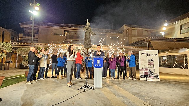 La concejala de Fiestas, Alba Sánchez, fue la encargada de desvelar el programa festivo, acompañada por el alcalde, José Miguel Luengo, el presidente de la comisión de fiestas, Ricardo Luna y una amplia representación de las peñas festeras, en un acto celebrado junto a la escultura de San Francisco Javier, en la plaza de España.