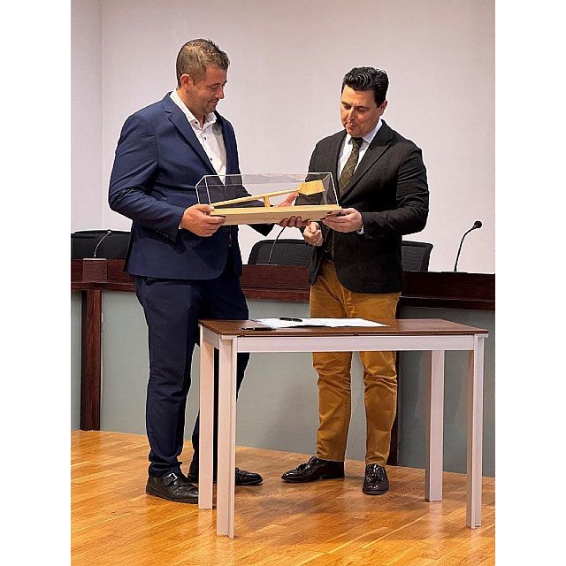 El remo, que elabora en madera el artista Nicolás de Maya y que replica su propia obra instalada en el vestíbulo del Ayuntamiento, simboliza el esfuerzo conjunto por el progreso del municipio.