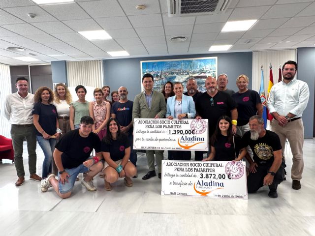 La peña Asociación Socio-cultural Los Pajaritos, que llevó la barra del Hot Rally San Javier 2025, ha hecho entrega hoy de un cheque de 5.262 euros, procedentes de la recaudación de la barra durante la concentración motera, a la Fundación Aladina, que trabaja en favor de los niños enfermos de cáncer y sus familias.