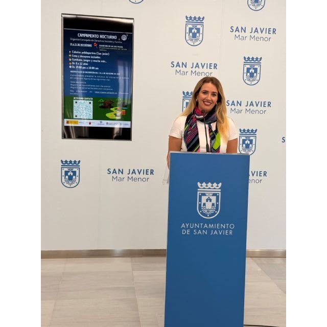 La concejala de Derechos Sociales y Familia, María del Mar Pérez, ha presentado hoy la actividad “Campamento nocturno”, que se estrena dentro del Plan Corresponsables “para seguir avanzando en el apoyo a las familias del municipio en la conciliación familiar y laboral”. La actividad, que se celebrará los viernes 14 o 21 de noviembre, en las cabañas de madera del polideportivo municipal de San Javier. es gratuita y está dirigida a niños y niñas de entre 8 y 12 años de edad. El campamento se desarrollará desde las 19:00h del viernes 14 o del viernes 21 hasta las 10:00h del día siguiente.