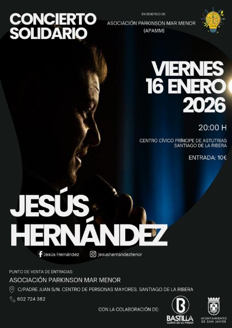 El Centro Cívico Príncipe de Asturias de Santiago de la Ribera será el escenario del concierto solidario que ofrecerá el tenor local Jesús Hernández el próximo viernes 16 de enero a las 20:00 h, con el objetivo de recaudar fondos para la Asociación Parkinson Mar Menor (APAMM). Las entradas ya están a la venta por 10 euros en la sede de la asociación (C/ Padre Juan s/n, en el Centro de Personas Mayores) y también se aceptan donaciones voluntarias.