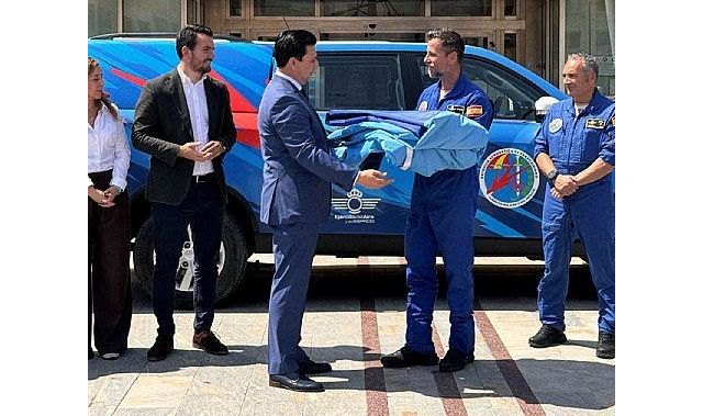 El alcalde de San Javier, José Miguel Luengo le ha hecho entrega hoy al Capitán, jefe de la PAPEA, el sanjaviereño, José Luis Lomas, de la bandera que ocupa un total de 54 metros cuadrados y que se podrá ver en uno de los espectaculares saltos de precisión que protagonizarán sus saltadores, durante su exhibición.